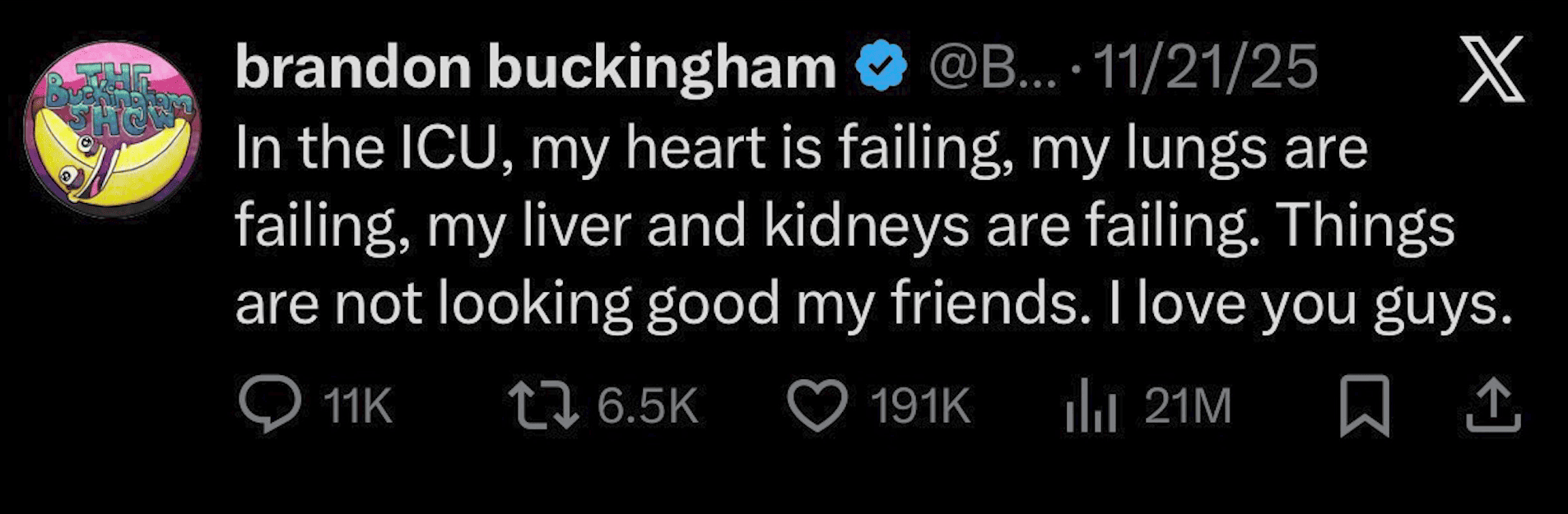 The health crisis had been building for months. Buckingham traces the beginning of his decline to June 2025 while filming a documentary about car thieves in Detroit, where his vehicle was fired upon with him in the front seat.