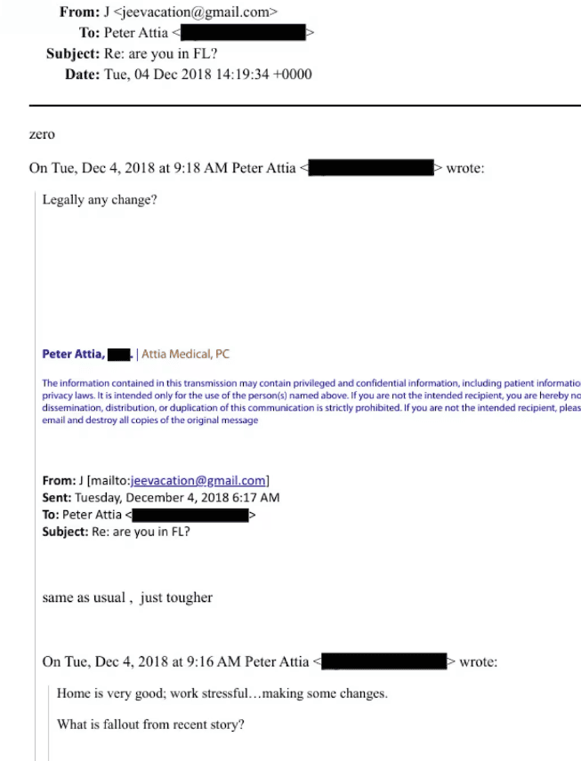 The correspondence continued with increasingly casual exchanges. In February 2016, Attia sent an email stating: “P**sy is, indeed, low carb. Still awaiting results on gluten content, though.”