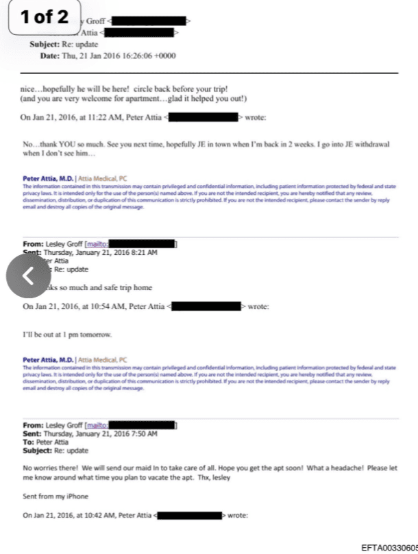 Additional details from the correspondence further complicate Attia’s account of his relationship with Epstein. Emails show Attia communicating directly with Epstein’s assistant about staying at Epstein’s New York apartment, an arrangement that is highly irregular for a physician-patient relationship.