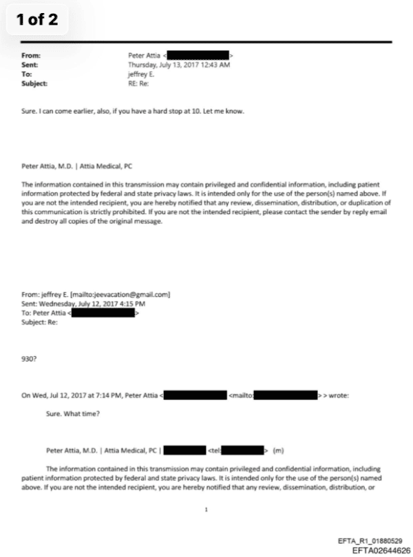 In one exchange, Attia reportedly joked about going into “JE withdrawal” when he hadn’t seen Epstein for a period of time.