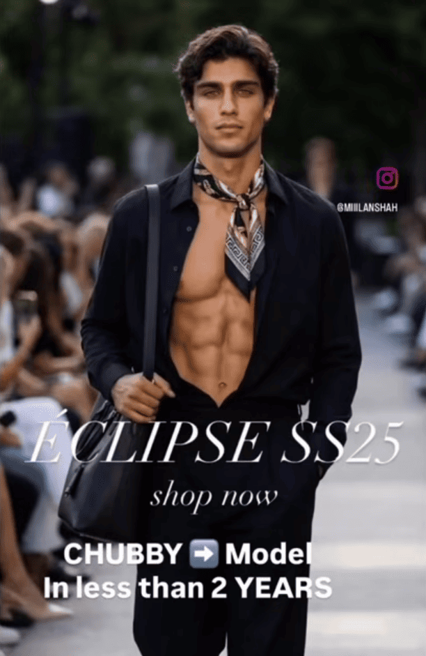 The financial exploitation is brazen. Milan Shah sells a detailed nutrition guide while claiming he transformed from “skinny fat” to “high fashion runway model” through dietary change. Except Milan does not exist.