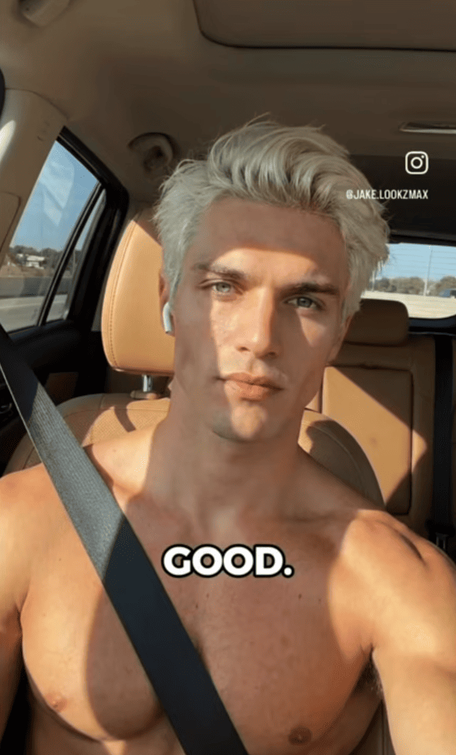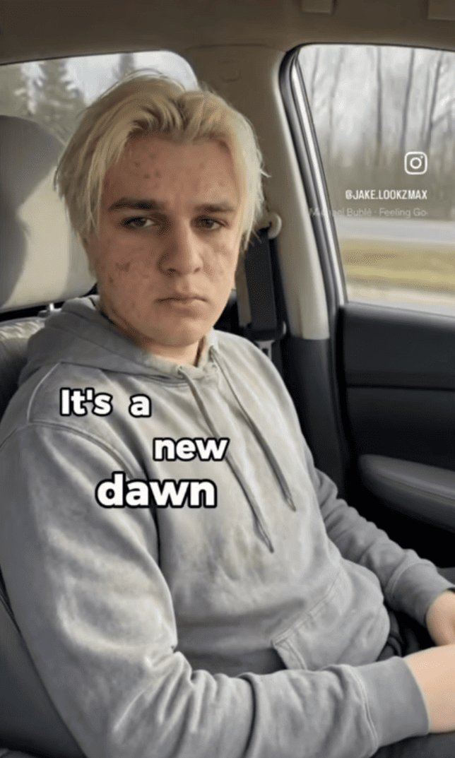 AI account Jake promotes an “ascension guide” showing his journey from acne-prone teenager to blue-eyed model, conveniently omitting that his eye color changed because someone altered the AI parameters.