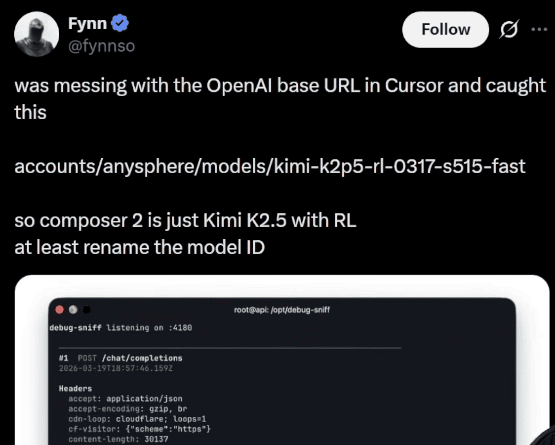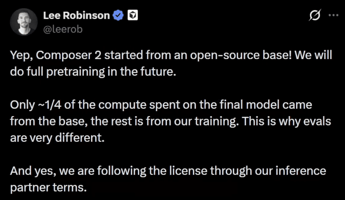 A Cursor employee named Lee Robinson acknowledged that Composer 2 “started from an open-source base” but still stopped short of naming Kimi directly.