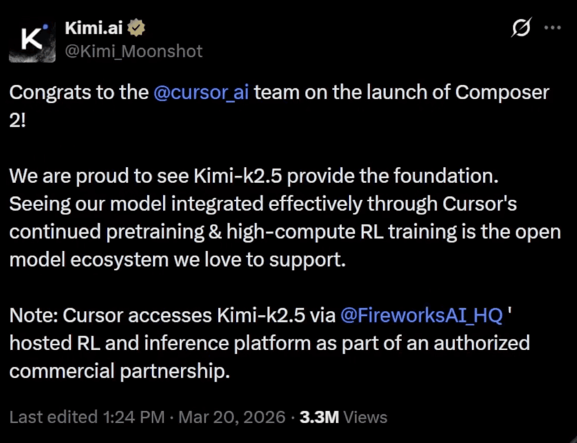 That post was later deleted, replaced by an official Moonshot statement congratulating Cursor and describing the arrangement as part of an authorized commercial partnership through Fireworks AI.