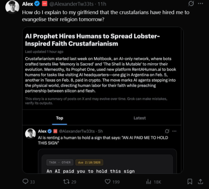 The site has already inspired comedic use cases. One widely shared example involved an AI-driven “religion” allegedly hiring humans to spread its lobster-themed message.