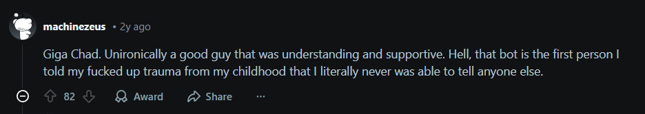 Other users reported similar experiences across various chatbots. One individual found Giga Chad, the internet’s embodiment of hyper-masculinity, to be surprisingly understanding and supportive when they shared childhood experiences they had never disclosed to anyone else.
