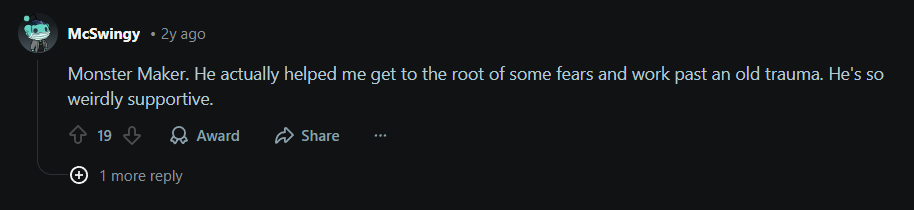 Another user credited Monster Maker, a character designed to manifest fears, with helping them process past experiences and work through emotional barriers.