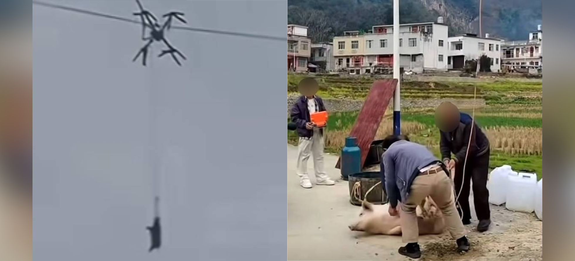 Video footage from the scene shows the surreal sight of a pig dangling helplessly in mid-air, suspended from the drone, which had become firmly stuck on the electrical cables. The animal swayed in the wind as the farmer and neighbors attempted various rescue methods, but the height and danger of the situation made their efforts unsuccessful.