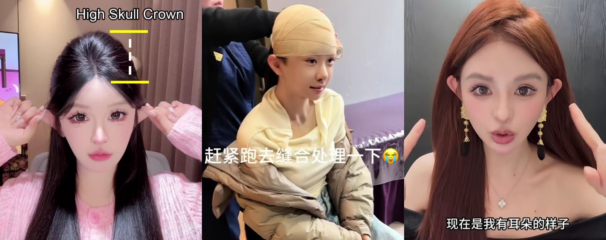 Running parallel to the high skull obsession is the “elf ear” trend, where individuals receive injections behind their ears to make them protrude outward. Influencer Chen Xianen posted before and after photos, claiming the injections made her face appear smaller.