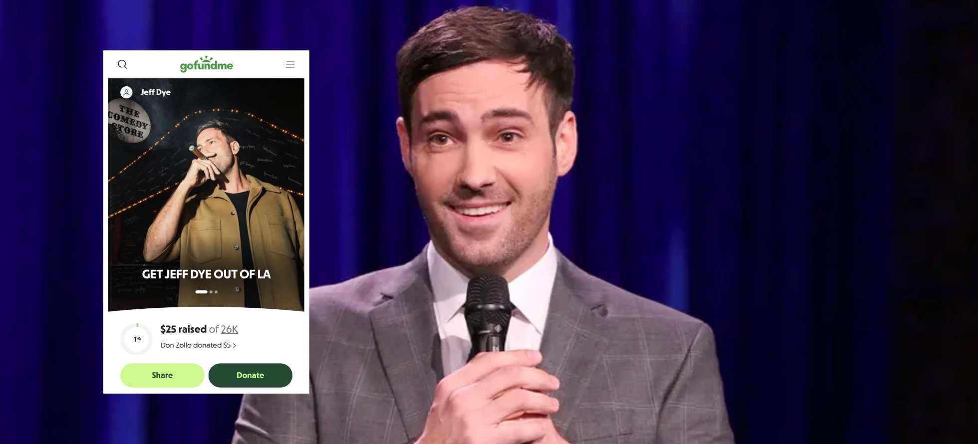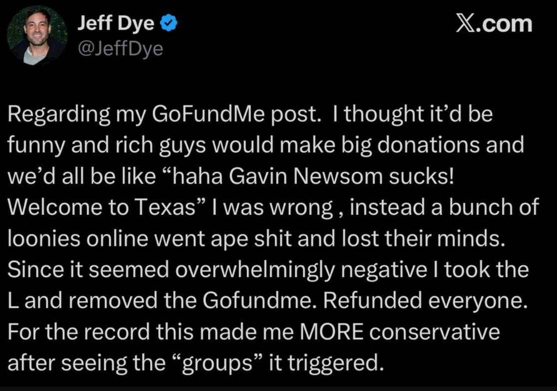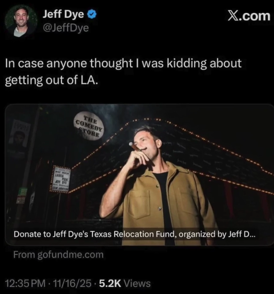 Comedian Jeff Dye found himself at the center of online ridicule after launching—and quickly deleting—a GoFundMe campaign to help finance his move to Austin, Texas.