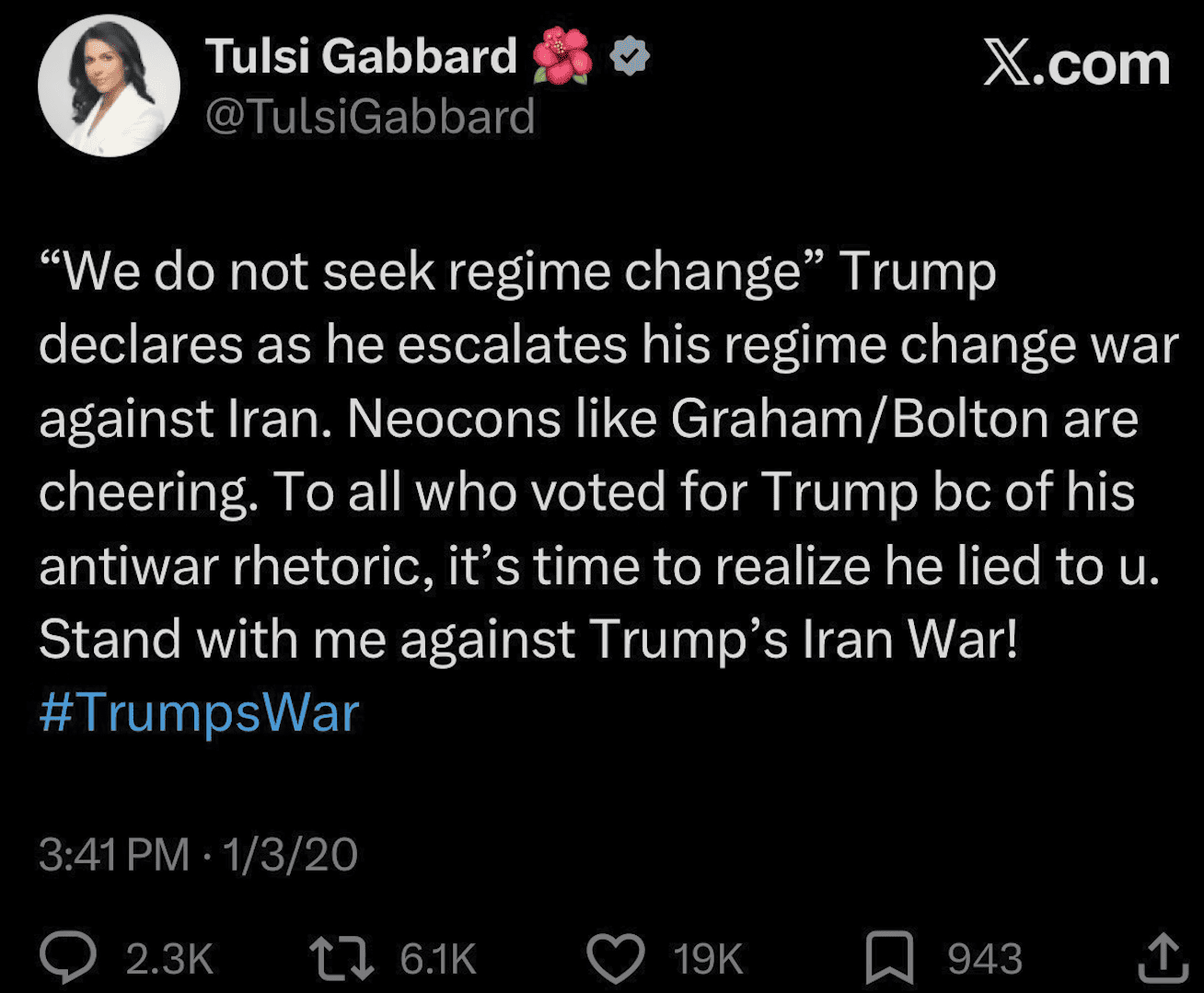 She famously sold t-shirts reading “No War with Iran” and in 2020 tweeted directly at Trump voters: “It’s time to realize he lied to you. Stand with me against Trump’s Iran war.”