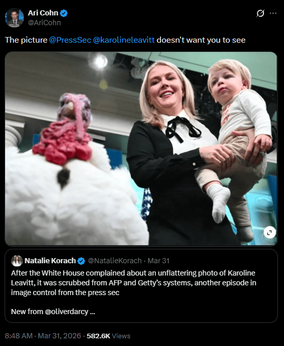 In a related episode involving image management, the White House reportedly complained after an unflattering photo of Press Secretary Karoline Leavitt circulated online. Following the complaint, the image was removed from the distribution systems of major wire services, including Agence France-Presse and Getty Images.