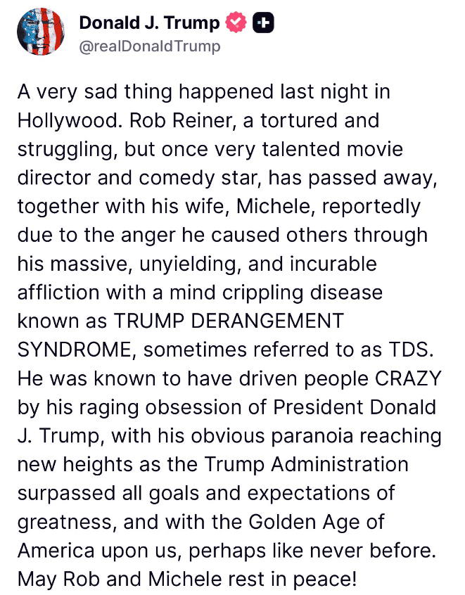 The president’s comments come after his initial Truth Social post acknowledged the “very sad” nature of the couple’s passing but stopped short of offering condolences. In that statement, Trump characterized Reiner as “a tortured and struggling, but once very talented movie director and comedy star,” and referenced what he described as “TRUMP DERANGEMENT SYNDROME, sometimes referred to as TDS,” a term commonly used by Trump’s supporters to describe those who criticize him.