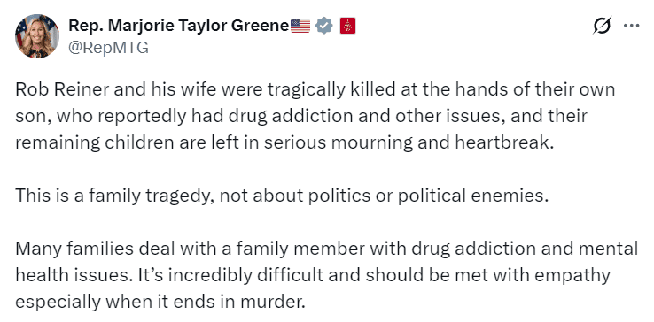 “Rob Reiner and his wife were tragically ended at the hands of their own son, who reportedly had s**stance dependency and other issues, and their remaining children are left in serious mourning and heartbreak,” Greene said. “Many families deal with a family member with substance dependency and mental health issues. It’s incredibly difficult and should be met with empathy especially when it ends in this way.”