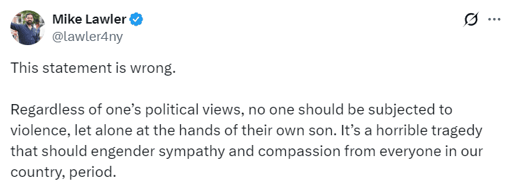 “Regardless of one’s political views, no one should be subjected to this, let alone at the hands of their own son,” Lawler said. “It’s a horrible tragedy that should engender sympathy and compassion from everyone in our country, period.”