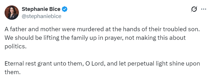 “A father and mother were taken at the hands of their troubled son,” Bice posted on X. “We should be lifting the family up in prayer, not making this about politics.”