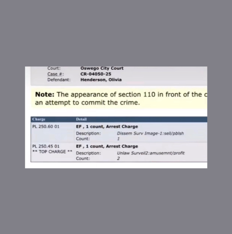 The tables turned dramatically when Henderson was arrested on November 10, 2025, and charged with two Class E felonies: dissemination of unlawful surveillance images and unlawful surveillance in the second degree.