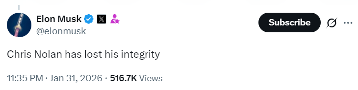 Musk amplified this criticism with his comment on social media about Nolan’s integrity. He tweeted: “Chris Nolan has lost his integrity”