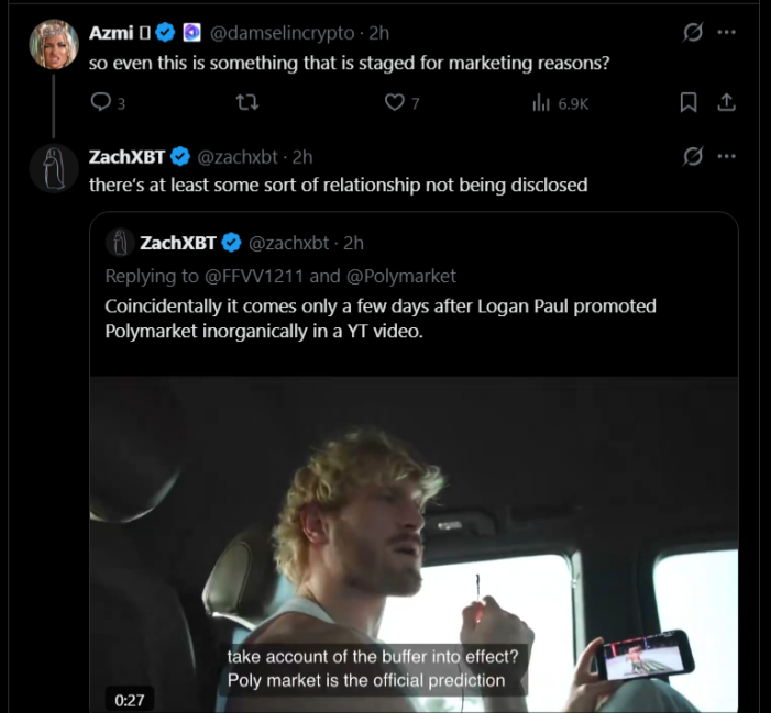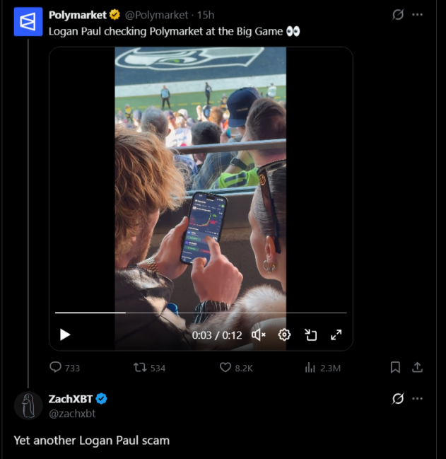 The timing raised additional red flags. ZachXBT noted that the Polymarket post arrived just days after Paul featured the platform in a YouTube video without proper disclosure. “Coincidentally it comes only a few days after Logan Paul promoted Polymarket inorganically in a YT video,” he wrote.
