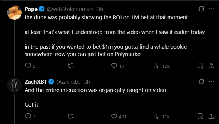 When another user suggested the interaction was genuinely captured, ZachXBT responded sarcastically: “And the entire interaction was organically caught on video. Got it.”