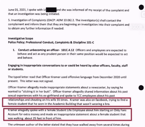 According to official complaint records, Kramer worked as a school resource officer before abruptly resigning following an internal investigation. The documents allege he made inappropriate comments about female students and mentioned starting an adult content platform to fellow officers.