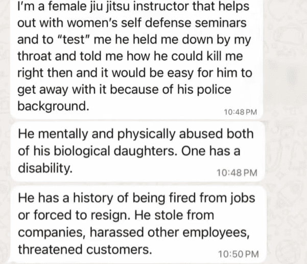 Additional accounts surfaced from individuals who knew Kramer personally, including one woman from a martial arts gym who described an unsettling encounter where he allegedly made threatening remarks about his police background.
