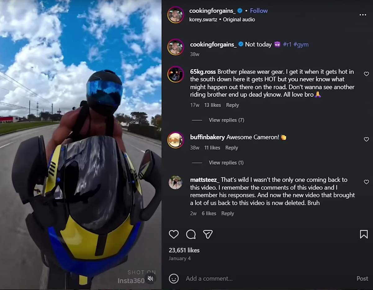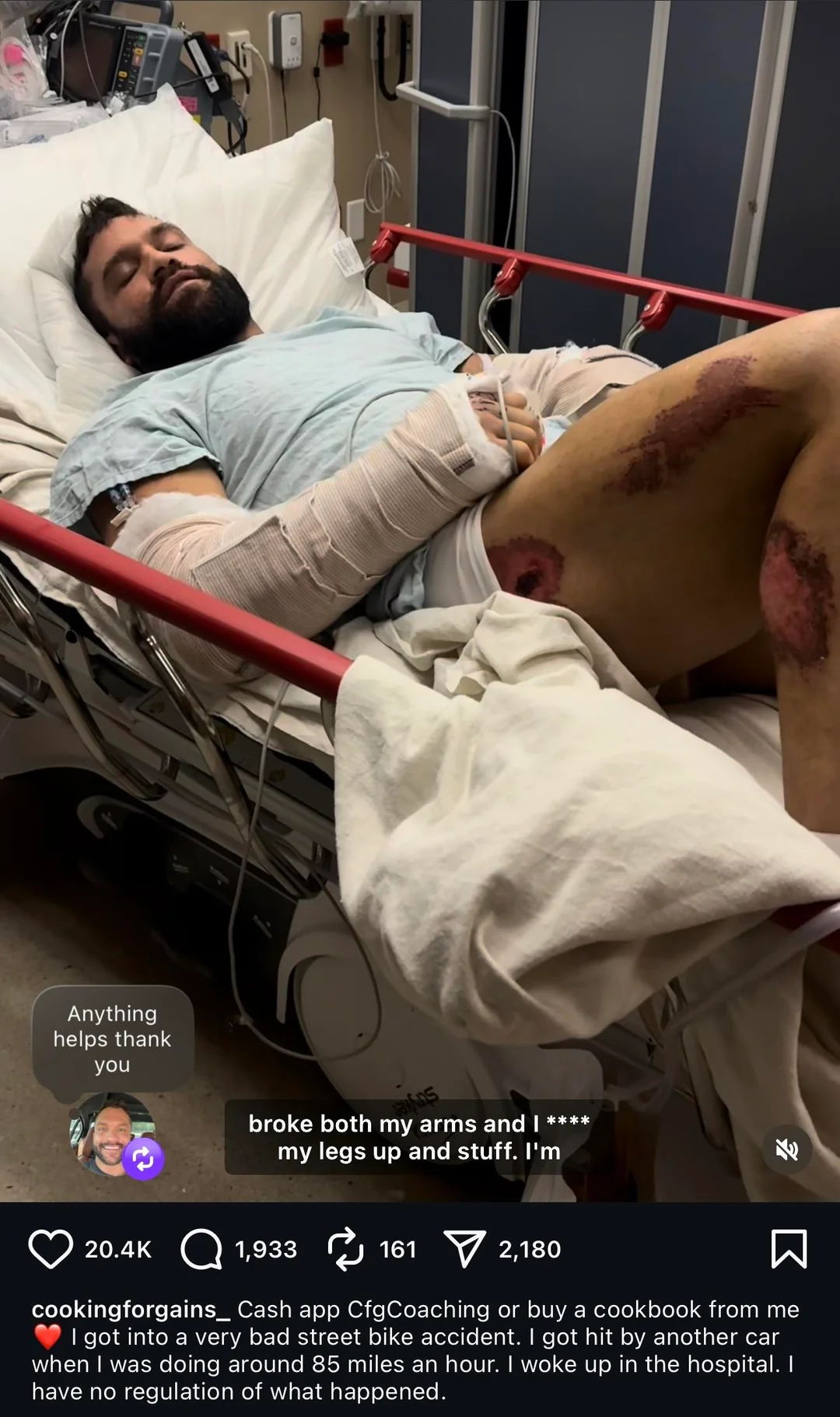 The fitness influencer world has witnessed another spectacular fall from grace. ‘Cooking for Gains‘ is a creator who built a massive 2.7 million following by sharing protein-packed recipes. He now finds himself begging his audience for money after a motorcycle crash. What makes this situation particularly egregious is the stark contrast between his previous displays of wealth and his current financial desperation.