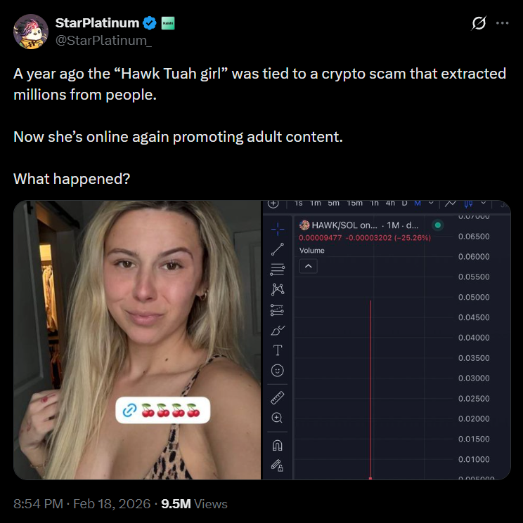 The turning point came in December 2024 when Welch launched her meme coin, $HAWK. Marketed as a way to fund her animal charity Paws Across America, the coin collapsed within 30 minutes of launch, losing 98% of its value.