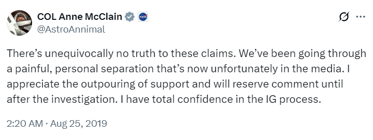 McClain maintained her innocence throughout the ordeal. Her attorney told The New York Times in 2019 that the astronaut was simply monitoring the couple’s shared finances, a practice that had been routine during their relationship.