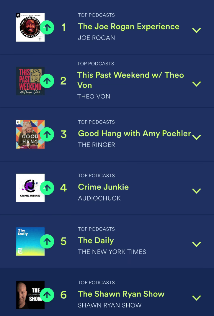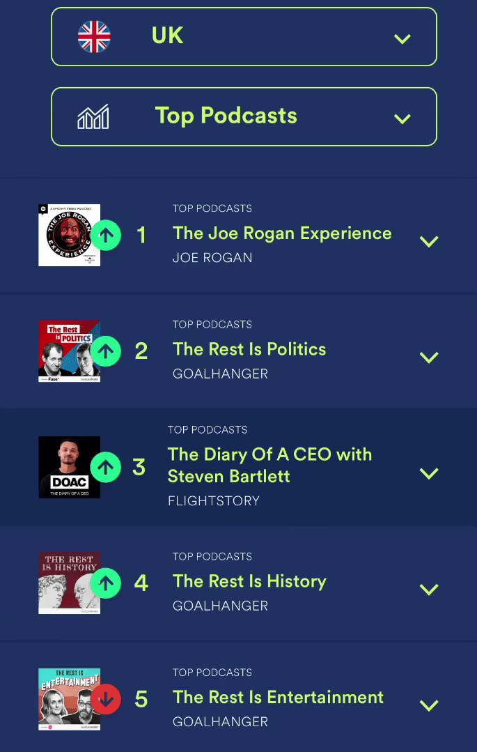 In the UK, Joe Rogan tops the charts, followed by “The Rest Is Politics,” hosted by two center-right former politicians, and “Diary of a CEO.”