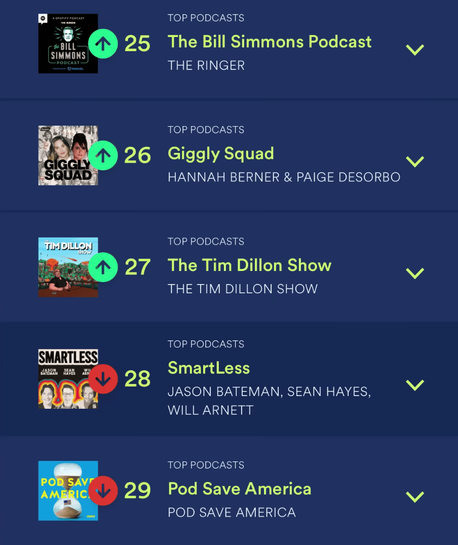 Meanwhile, left-wing political podcasts are virtually absent from the top 30, with liberal establishment podcast Pod Save America barely scraping in at number 29.