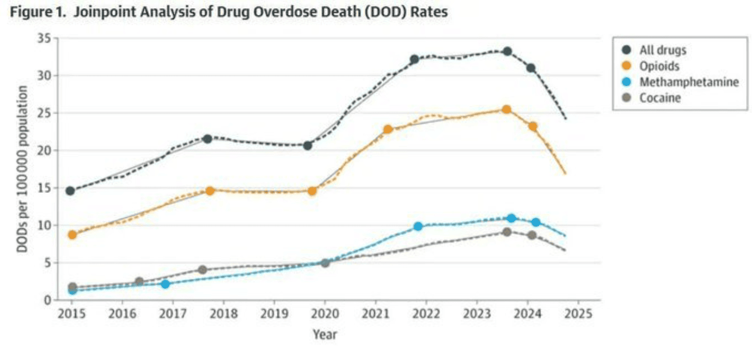 When examining the graph, Rogan pointed to what he interpreted as a significant decline in overdose deaths, telling his guest to “look at that drop” in the statistics displayed. He specifically referenced the chart showing deaths from all d**gs, noting what appeared to be a peak between 2023 and 2024, followed by a downturn.