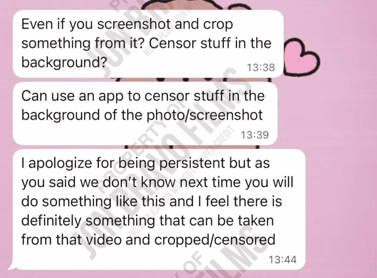 Despite her clear discomfort, the messages show Wheels persistently encouraging these activities and requesting photographic and video documentation.