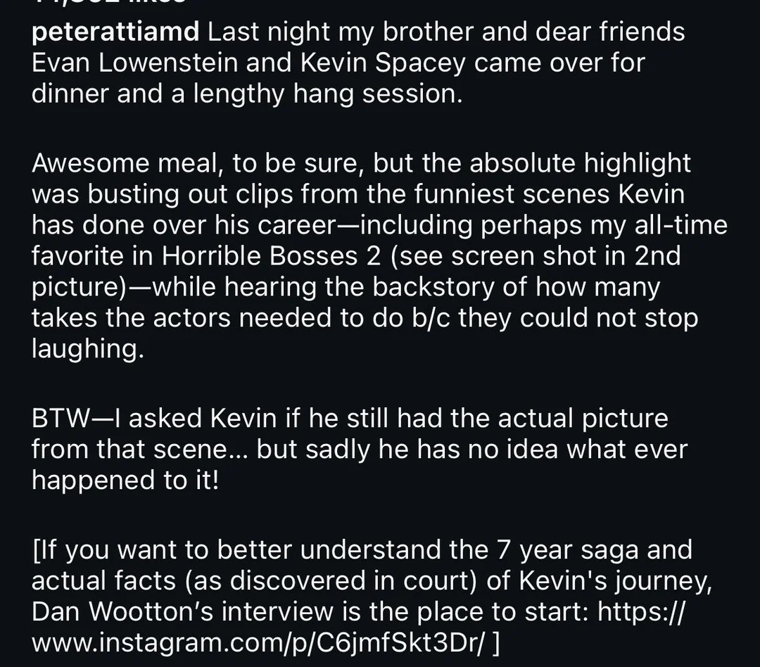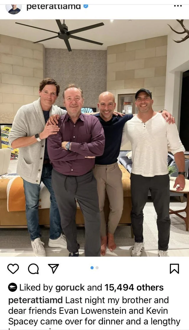 Dr. Peter Attia recently shared a picture with another member of Epstein’s circle – Kevin Spacey along with a claim that Spacey has been exonerated.
