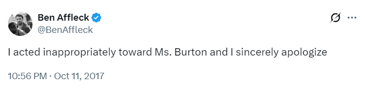 Burton, who was in her early twenties at the time, said she had laughed it off on air “so I wouldn’t cry.” When the clip resurfaced amid the Harvey Weinstein revelations, Affleck publicly acknowledged the incident. He tweeted: “I acted inappropriately toward Mrs. Burton and I sincerely apologise.”