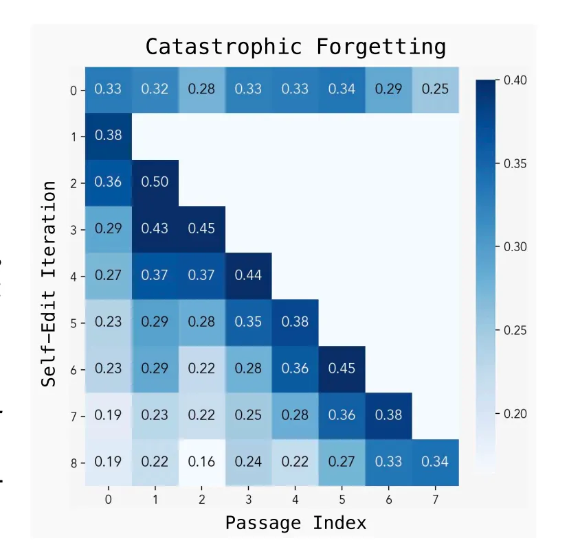 Computational overhead presents another challenge. Evaluating each self-edit requires fine-tuning and performance testing, consuming 30 to 45 seconds per edit — substantially more than standard reinforcement learning tasks.