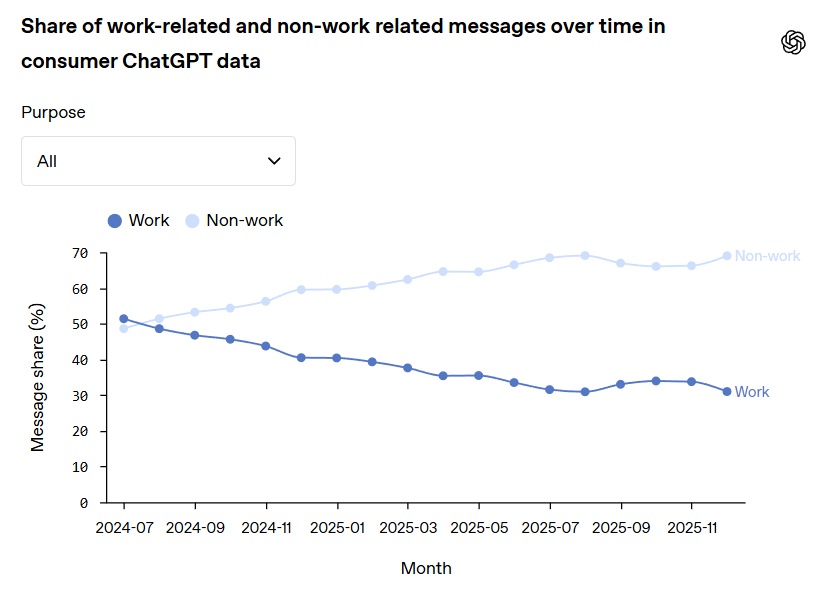 New research from OpenAI has revealed a transformation in how people interact with ChatGPT. Between July 2024 and December 2025, work-focused conversations on the consumer version of the platform steadily declined, while personal inquiries surged.
