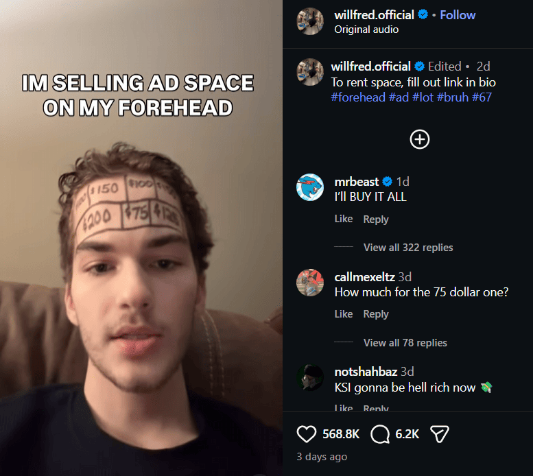 He laid out visual mockups showing how brand placements might appear across his forehead, The post spread quickly, drawing responses from brands and curious onlookers. Then MrBeast showed up in the comments with four simple words that changed everything.