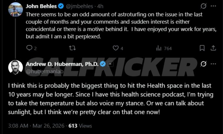 Huberman responded by framing his engagement as a natural extension of his platform: “I think this is probably the biggest thing to hit the health space in the last 10 years, maybe longer. Since I have this health science podcast, I’m trying to take the temperature but also voice my stance. Or we can talk about sunlight, but I think we’re pretty clear on that one now.”