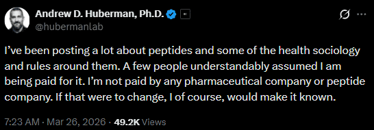 In a direct statement on X, Huberman addressed the speculation head-on: “I’ve been posting a lot about peptides and some of the health sociology and rules around them. A few people understandably assumed I am being paid for it. I’m not paid by any pharma company or peptide company. If that were to change, I of course, would make it known.”