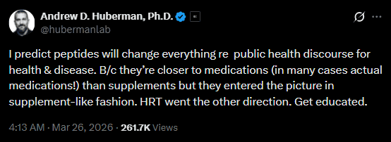 That post arrived shortly after he had published a sweeping prediction about where the science is heading: “I predict peptides will change everything re public health discourse for health and disease. Because they’re closer to medications, in many cases actual medications, than supplements but they entered the picture in supplement-like fashion.”