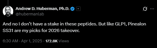 Then in April, in a post where he again disclaimed any financial stake, he offered specific picks for what he called “2026 takeover” compounds: GLP-1, Pinealon, and SS31.