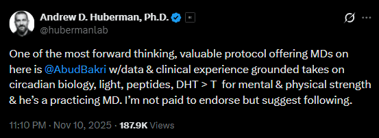 In one post, he publicly flagged Dr. Abud Bakri as “one of the most forward thinking, valuable protocol offering MDs on here” with expertise in peptides, while making a point of adding that he was “not paid to endorse.”