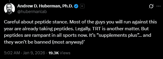 In another, responding to an athlete concerned about competition, he wrote: “Careful about peptide stance. Most of the guys you will run against this year are already taking peptides. Legally.” He went further in a separate post, stating plainly: “I get asked about peptides almost every week by pro and other athletes. It’s rampant right now.”