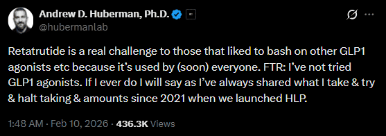 Huberman’s situation is further complicated by his earlier commentary on the related GLP-1 space. In February, he was asked to clarify whether he was personally using GLP-1 agonists after writing publicly about retatrutide and what he called the predictable path these compounds take from bodybuilding communities into Hollywood and then mainstream medicine.