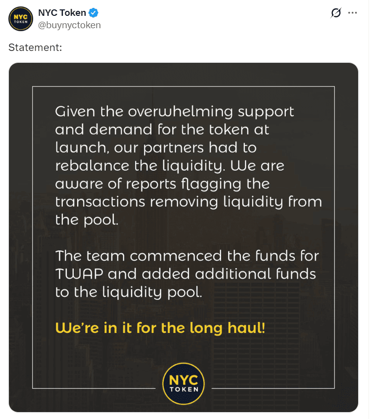 The New York City Token has no official affiliation with New York City government. Its only distinguishing feature is Adams’s involvement as former mayor, now leveraging the city’s brand to promote a speculative digital asset.