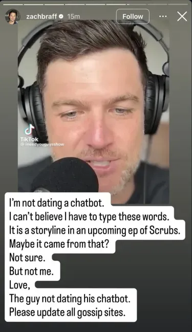 Once the episode spread online, Braff reposted a clip and addressed the claims directly. “I’m not dating a chatbot. I can’t believe I have to type these words,” he wrote. “It is a storyline in an upcoming ep of Scrubs. Maybe it came from that? Not sure. But not me. Love, The guy not dating his chatbot. Please update all gossip sites.”