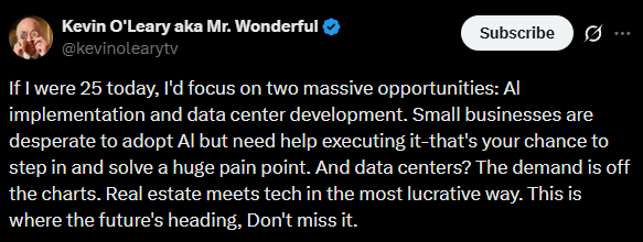 On social media, O’Leary  wrote in the caption: “If I were 25 today, I’d focus on two massive opportunities: AI implementation and data center development. Small businesses are desperate to adopt AI but need help executing it, that’s your chance to step in and solve a huge pain point. And data centers? The demand is off the charts. Real estate meets tech in the most lucrative way. This is where the future’s heading. Don’t miss it.”