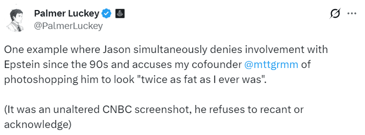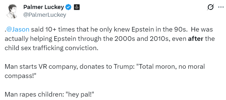 Luckey posted on X that Calacanis “said 10+ times that he only knew Epstein in the 90s. He was actually helping Epstein through the 2000s and 2010s, even after the child s*x trafficking conviction.”