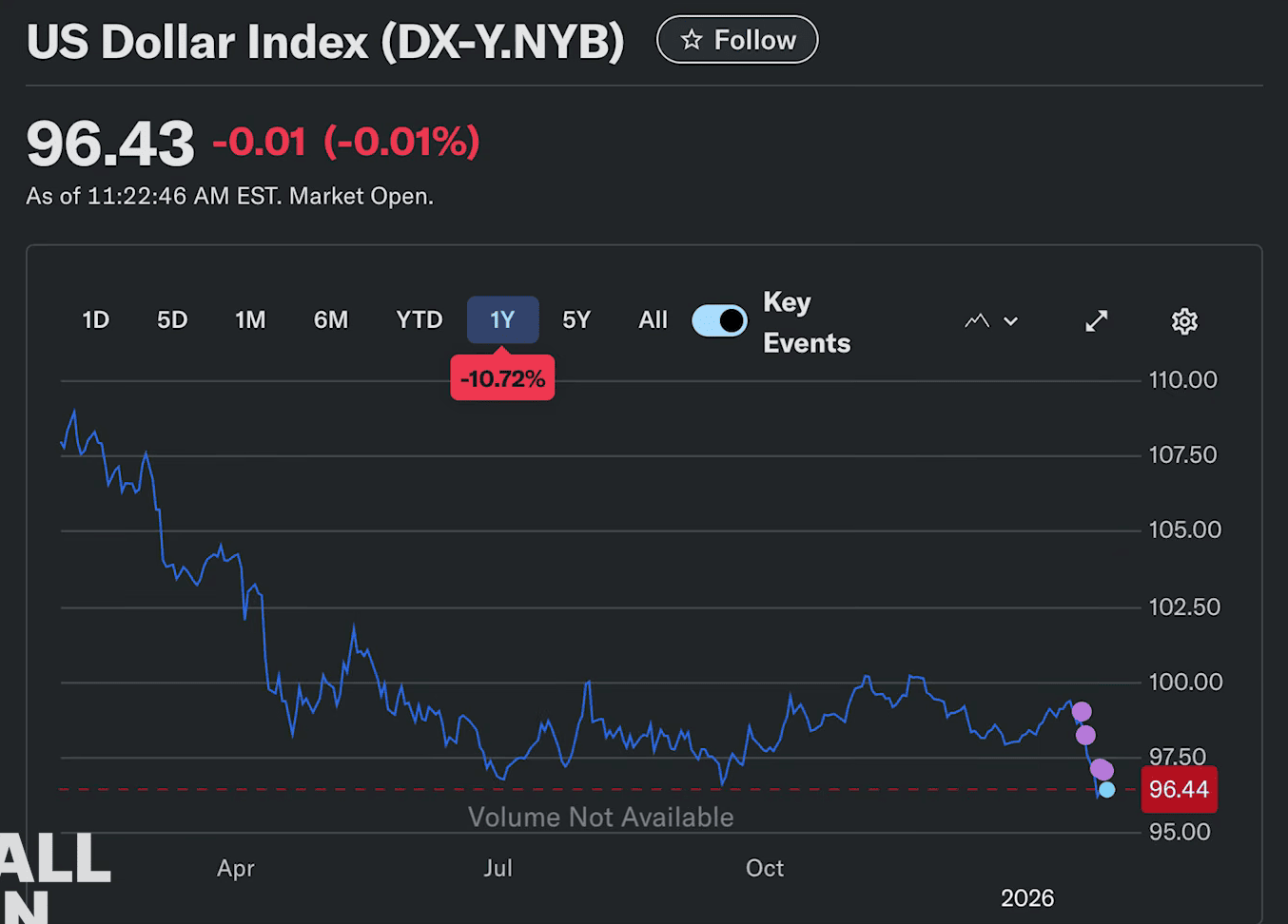 Friedberg began by presenting data on the declining dollar. “This is the dollar index. So it’s the dollar against a basket of foreign currencies has declined from an index of about call it 109 down to 96 today,” he explained, before making a striking observation about stock market performance when measured in real assets rather than inflating currency.